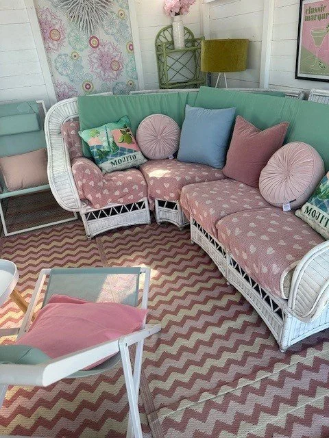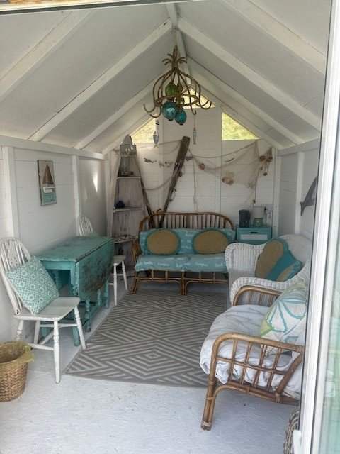 This hut has a seaside theme, it has a wicker sofa and chair with comfy cushions and throws. This is the nearest to a living room, and is a comfy space to watch the sea, a storm, or the sunset.