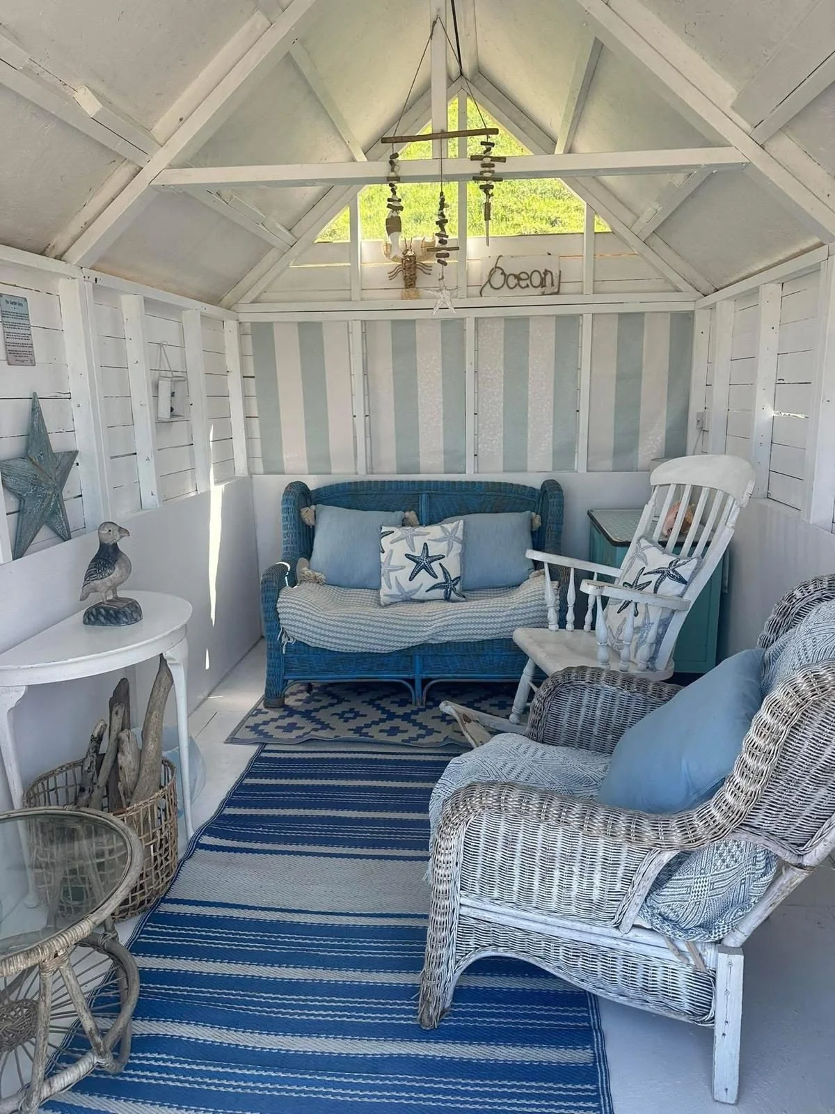 This hut is in memory of a dear friend Claire, it is in muted lavendar and grey colours and is based on a picture that we love that is on the back wall. It has a table that seats 6, and a comfy wicker chair and a rocking chair. Perfect for families or if you want to relax and then later dine in your hut.