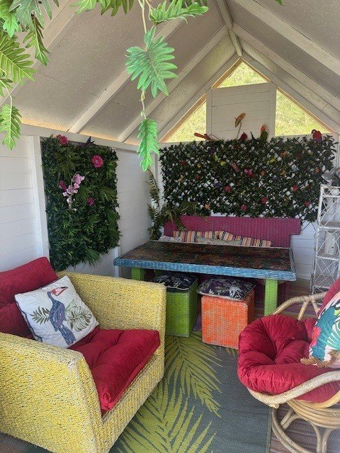 This hut has a Tropical Palm theme, with a hint of Caribbean. It has a table to sit around with a wicker settee and stools. It has 🦜 parrots, 🦋 butterflies and 🌺 flowers, with lots of green and bright Carribbean colours.